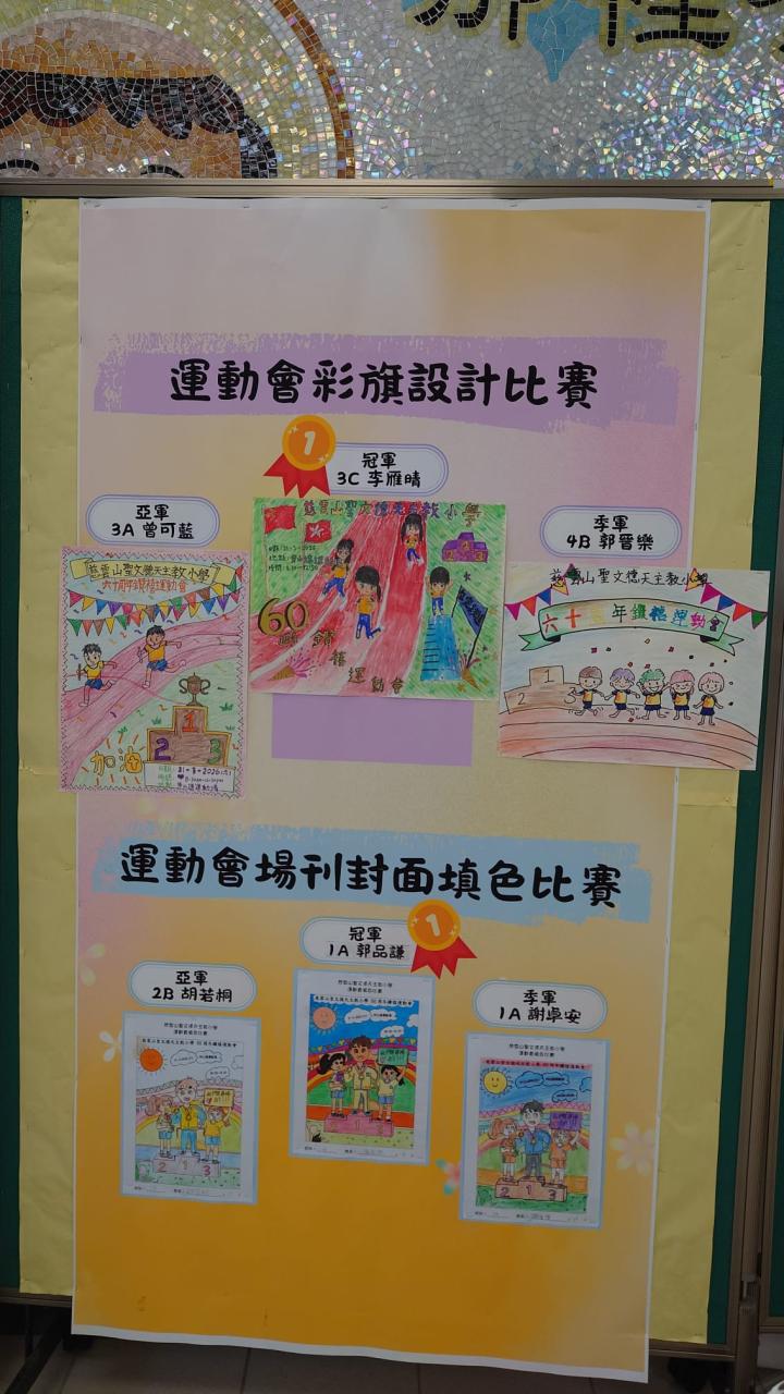 本校在12月份,舉辦了三項有關60周年鑽禧運動會的比賽,包括場刊封面設計比賽、彩旗設計比賽及場刊封面填色比賽,以下是得獎同學的名單: