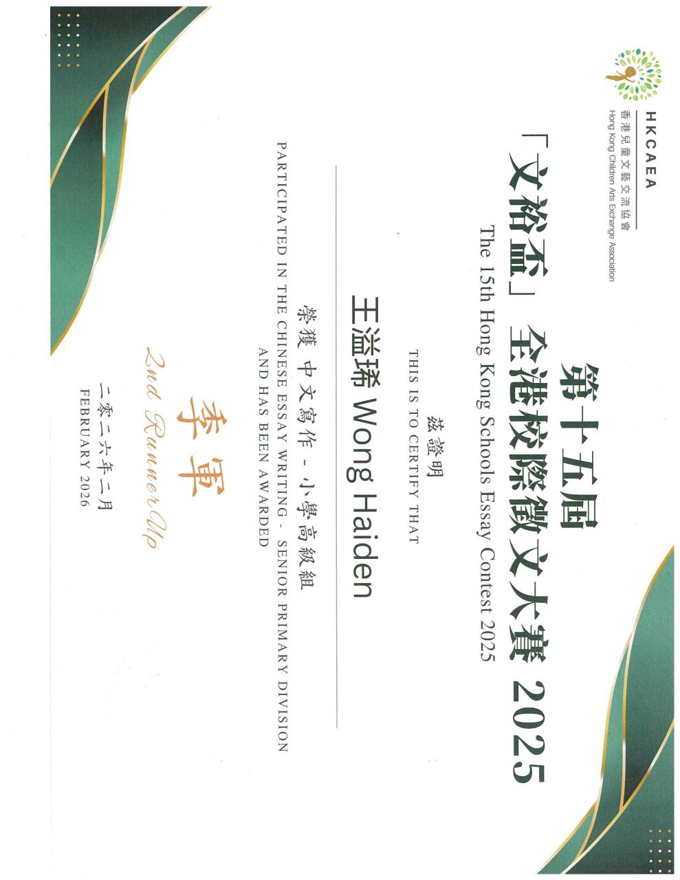 香港兒童文藝交流協會「文裕盃」全港校際徵文大賽2025